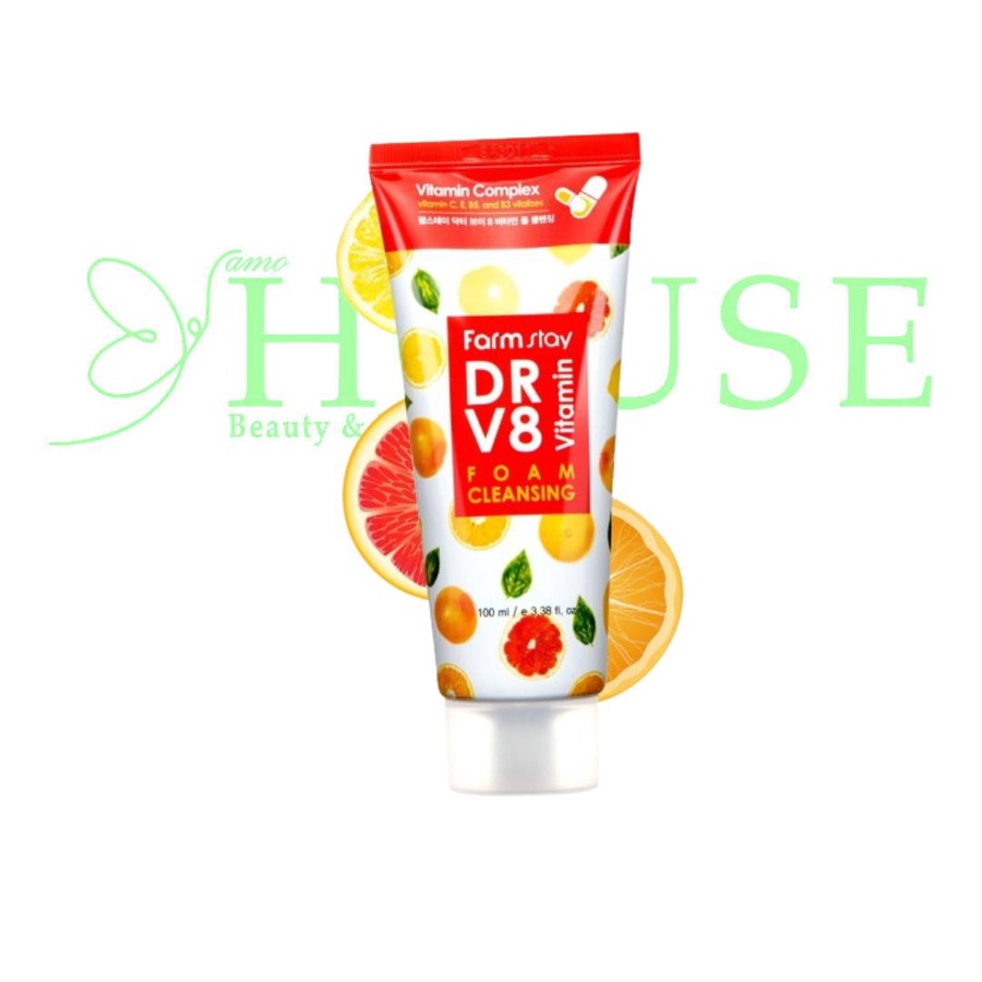 Farm Stay DR-V8 Vitamin Foam Cleansing هو غسول كوري غني بمركّب فيتامينات V8 يساعد على تنظيف البشرة بعمق وإزالة الأوساخ، الزيوت الزائدة، وبقايا المكياج دون التسبب في جفاف.